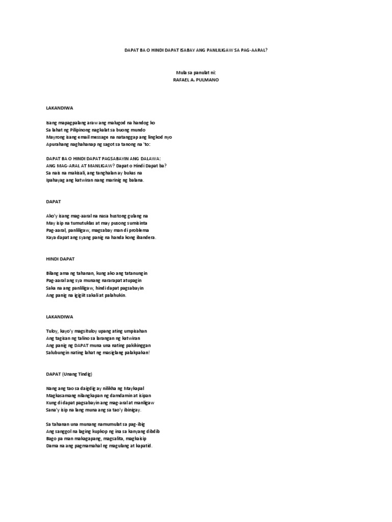 Sa tingin ko depende iyon sa kasalanan ng bata. Ang mga makatang ditoy napipisan sa ngalang pagtulay inaanyayahan. Aral at ligaw dapat ba o hindi dapat isabay ang panliligaw sa pag-aaral Averel Sy HINDI DAPATBilang ama ng tahanan kung ako ang tatanungin Pag-aaral ang sya munang nararapat atupagin Saka na ang panliligaw hindi dapat pagsabayin Ang panig na igigiit sakali at palahukin.